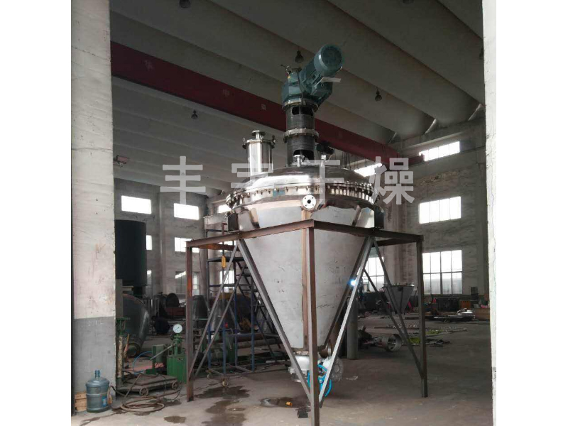 本機由加熱錐體設有加熱夾套,熱源為熱水、導熱油或低壓蒸汽,從而使錐體內壁保持一定的的溫度。變頻調速電機經平行斜齒輪減速機,驅動單螺帶攪拌器旋轉,帶動物料沿錐型筒旋轉并自下而上提升,物料到達最高點后由重力和慣性作用,自動流向旋渦中心回到錐型筒體底部,整個過程使物料在錐型筒體內強制加熱,相對對流、摻混,熱量在物料中相互擴散,使物料作全方位的不規(guī)則往復運動,完成物料同單螺帶和筒壁表面進行高頻率傳熱交換,在短時間內達到加熱干燥的效果。從而使物料內部水份不斷蒸發(fā),在真空泵的作用下,水蒸汽由真空泵引出,如須回收液體可加冷凝器、回收液儲罐回收。干燥完成后,打開下部的出料閥出料。